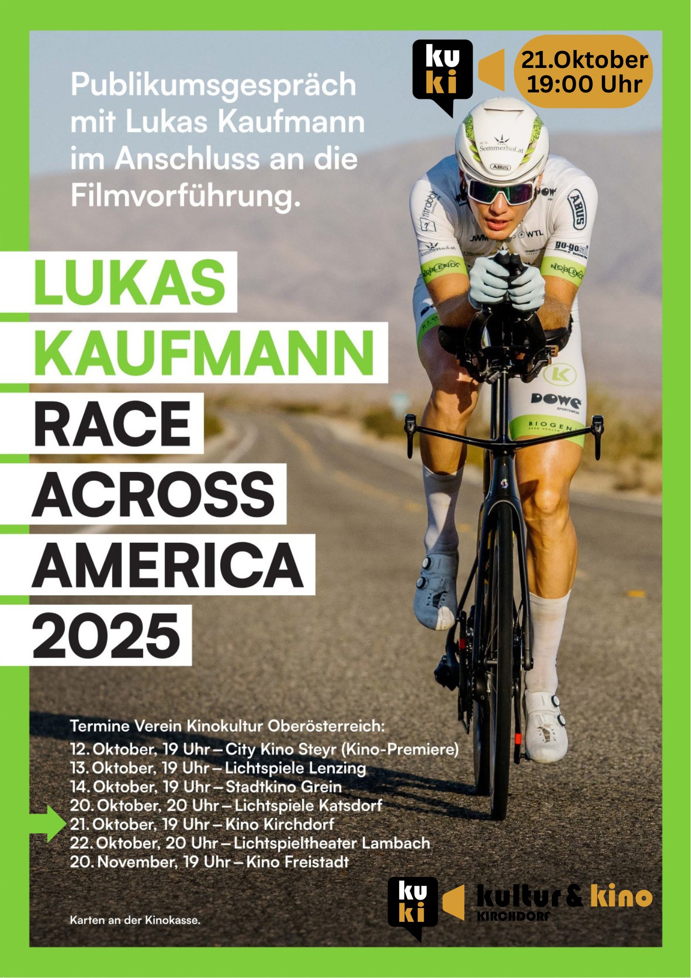 Nach 2024 gab's heuer wieder einen zweiten Platz beim legendären Race Across America. Nun gibt es die Gelegenheit, dieses einzigartige Abenteuer hautnah zu erleben! In einem 65-minütigen Film entführt dich Lukas Kaufmann auf die epische Reise quer durch die USA. Sei dabei, wenn sich die Grenzen von Ausdauer und Willensstärke in einem der härtesten Radrennen der Welt zeigen!