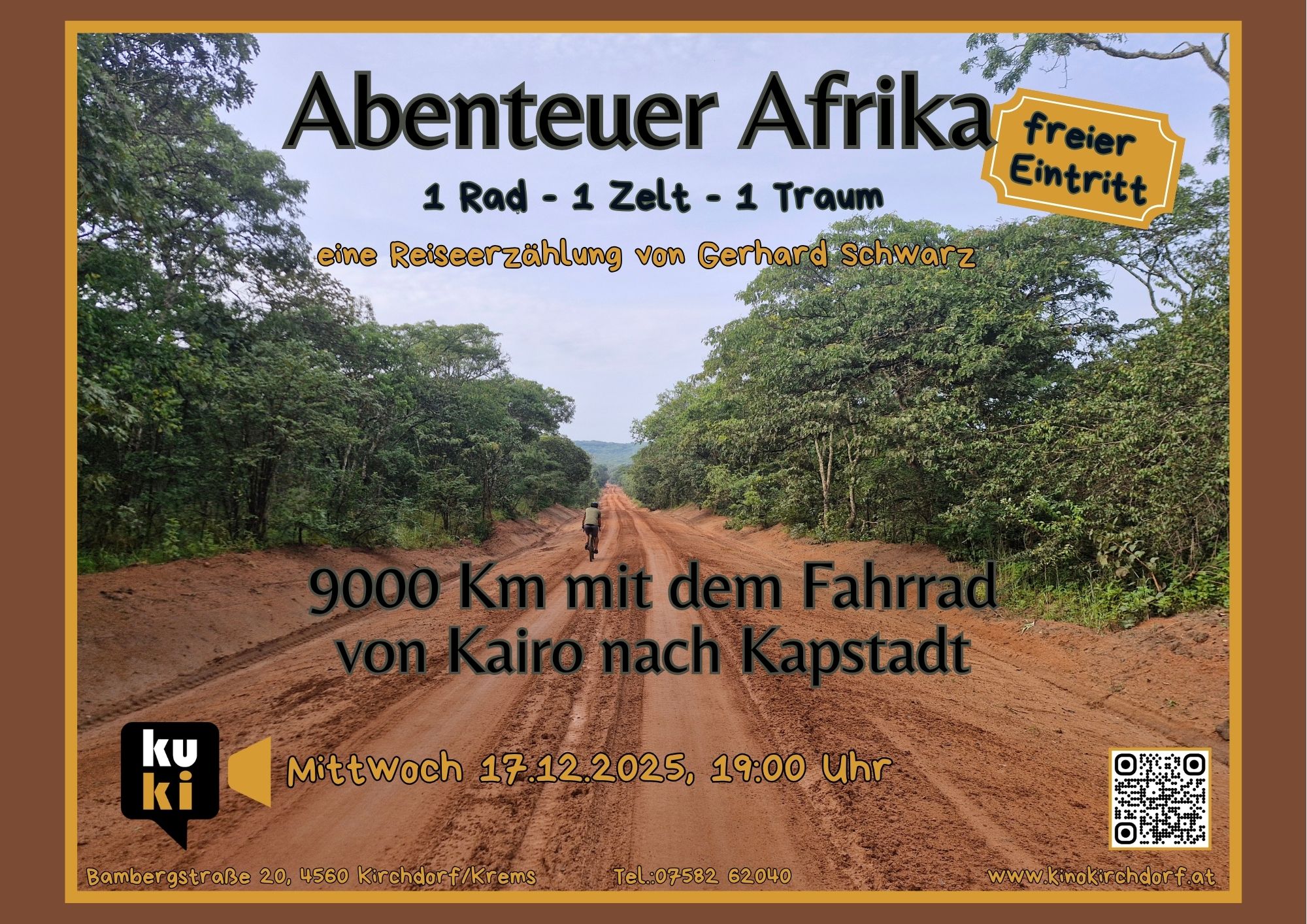 Zu seinem 70er hat Gerhard Schwarz mal eben mit dem Fahrrad Afrika durchquert, von Kairo bis Kapstadt. 9.000 km und 75.000 Höhenmeter waren oft auf schlechten Wegen zu bewältigen. Von den faszinierenden Landschaften, Begegnungen mit Menschen, Tierbeobachtungen, den 99 Nächten im Zelt und Vielem mehr wird er in diesem spannenden Vortrag berichten.