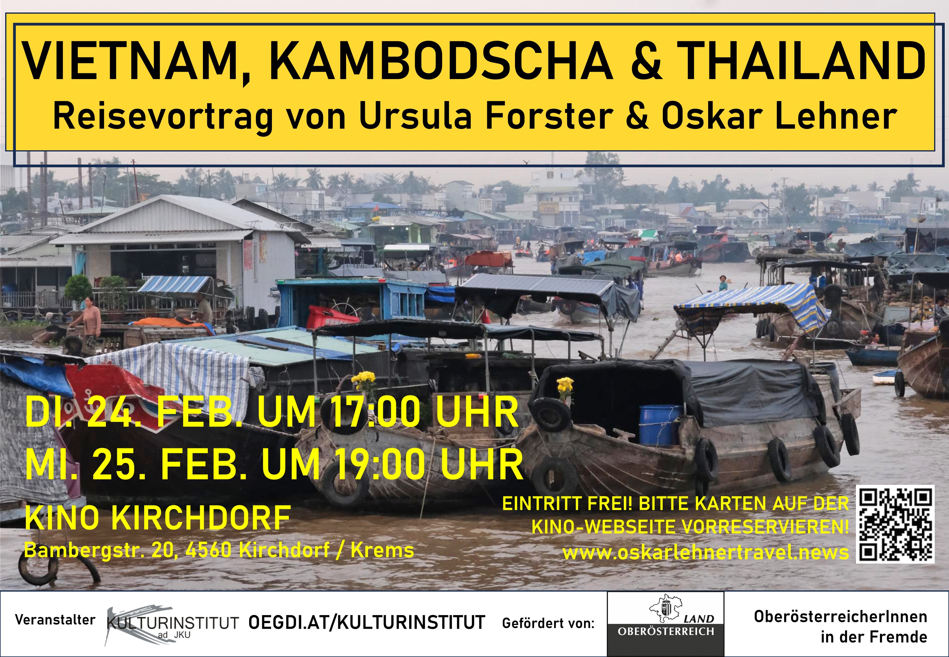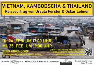 Die beiden Vortragenden Ursula Forster und Oskar Lehner reisen seit 2016 in einem zu einem Wohnmobil umgebauten Geländewagen um die Welt. Im Rahmen ihrer Fahrt entlang der historischen Seidenstraße bereisten die beiden im Winter 2024/25 Vietnam, Kambodscha und Thailand. Wie auch bei ihren früheren Reisevorträgen steht die Beschreibung der politischen Geschichte, der Kultur und des Lebens der Menschen im Mittelpunkt der Vorträge.